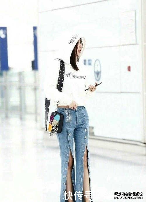 同樣是李菲兒的裝束,她這一身衣服,其中吸引人的地方就是她的褲子,款式真的是很新穎,小編記得韓雪也穿過這樣的褲子,但是她是休閑褲而不是牛仔褲,短款的衛衣將她很好腰部線條露出來,真的是很性感哦!