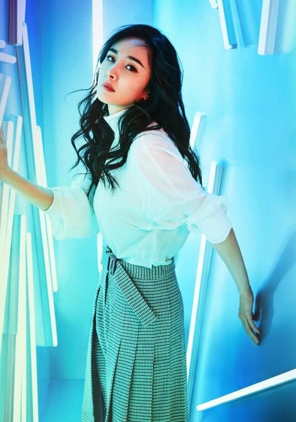 楊冪拍時尚大片,她穿了一件純白色的襯衫,顯出幹練利落的感覺。她在下面搭配灰色格紋的褶裙,頗具學院風,削弱了襯衫的正式感,透出少女風。楊冪披着她標誌性的大波浪捲髮,明媚動人!