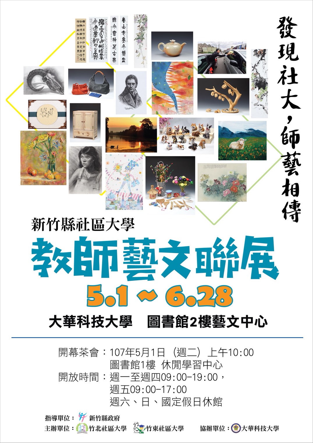 自大華科技大學接辦新竹縣的竹東與竹北社區大學以來,兩所社大有了蓬勃的發展,廣受地方好評,也成為新竹縣民終身學習的最佳學習場域。為展現兩所社大於藝文領域課程的成果,特別規劃了新竹縣社區大學教師藝文聯展 – 【發現社大‧ 師藝相傳】,參展的教師20餘位,展出作品則包括素描、書畫、攝影、木工、皮件、陶藝、紙黏土等近百件,每件作品都展現了老師們在社大教學的經驗與技藝的分享,非常值得愛好藝文的人士前往觀賞。
