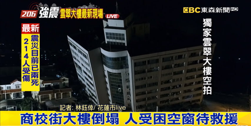 花蓮規模6.0強震造成雲門翠堤大樓(阿官火鍋)傾斜45度,有持續傾斜跡象,消防署表示,急需鋼構支撐。不過,稍早傳來好消息,救難人員救出一名2歲女童,但疑似還有20多人受困,搜救犬已加入搜救工作,軍方也出動生命探測儀。